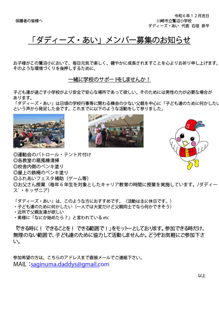 私たち「ダディーズ・あい」は、日頃の学校行事等に関わる機会の少ない父親を中心に、「子ども達のために何かしたい」という想いから発足した、鷺沼小の父親の会です。