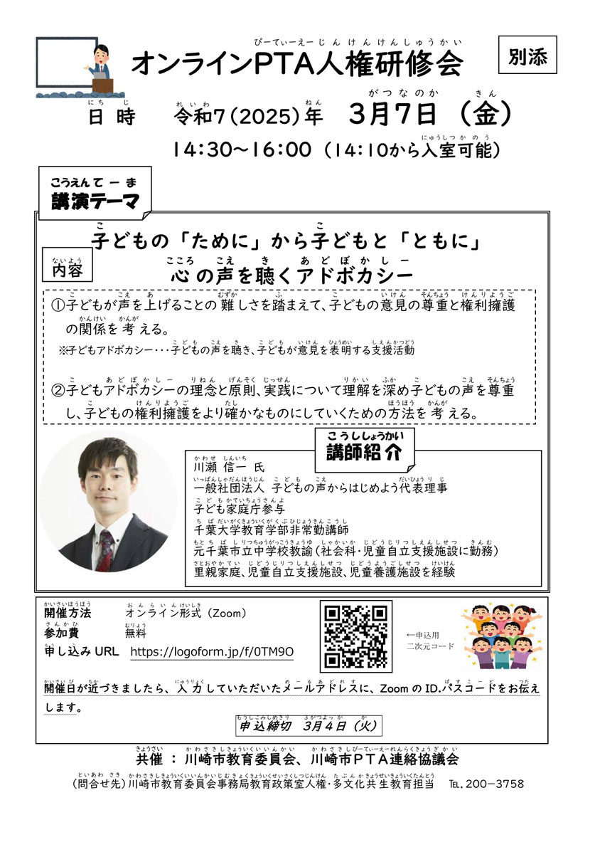子どもの人権をテーマに保護者を対象とした『オンラインPTA人権研修会』が川崎市PTA連絡協議会との共催により開催されます。