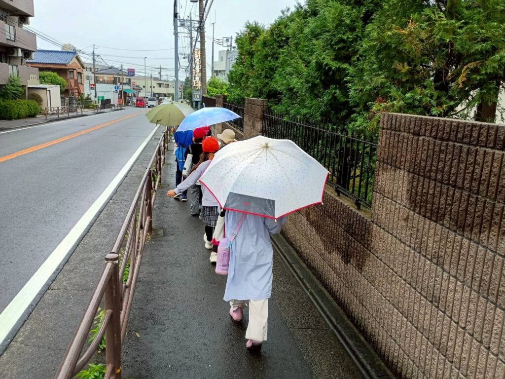 道中の子供たちは、交通ルールを守るだけでなく、ベビーカーやお年寄り等、他の歩行者へも気遣いができ、始まりと終わりにはしっかりとあいさつもできていて、ちょっぴり成長を感じました。途中雨が降ってきたのですが、「傘を交換したりおもしろかった」とも言っていて、雨が降ってきても楽しいことに変えられることに、大人も見習わなくてはと思いました。