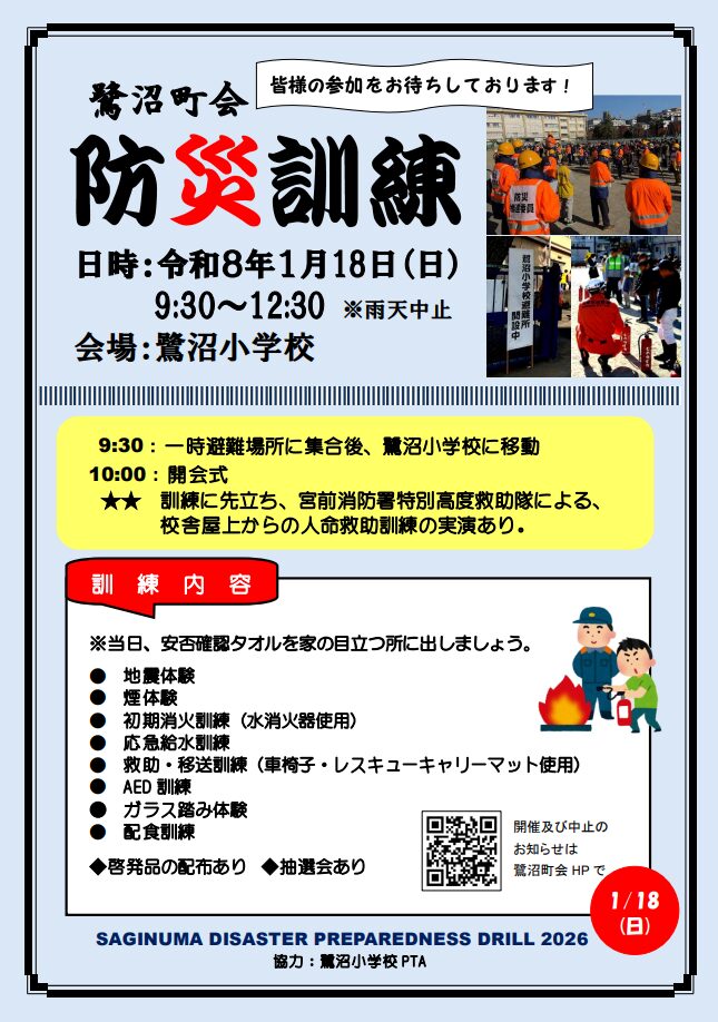 鷺沼町会主催の防災訓練が今年も開催されます!鷺沼小PTAも運営に協力します。