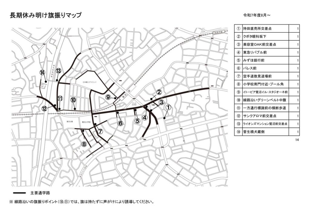 令和7年度の旗振りポイントはこの14か所をベースにしながら、交通状況などに応じて保護者を配置